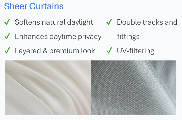 - Made-to-measure curtains and sheers — delivered and professionally installed
